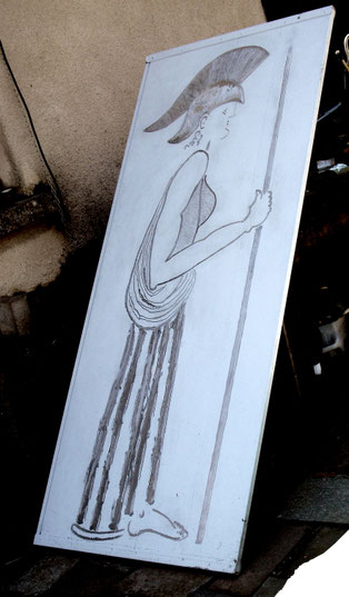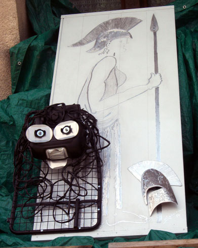 Ci-contre détail de la tête casquée d'ATHENA le panneau peint en blanc a été gravé pour faire apparaitre l'alu brillant du dessous. Remarquer l'ajout du fer de lance rapporté en alu.